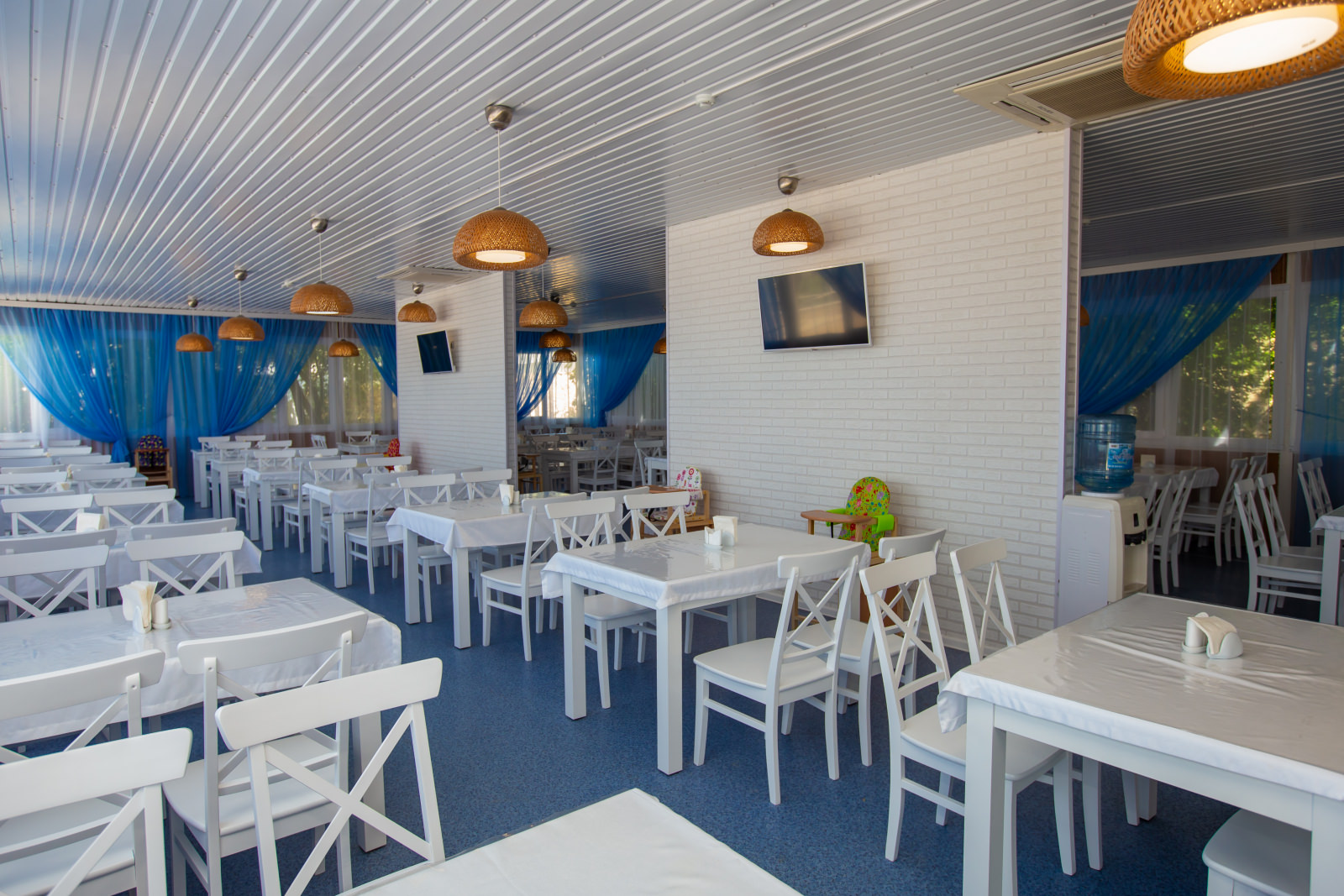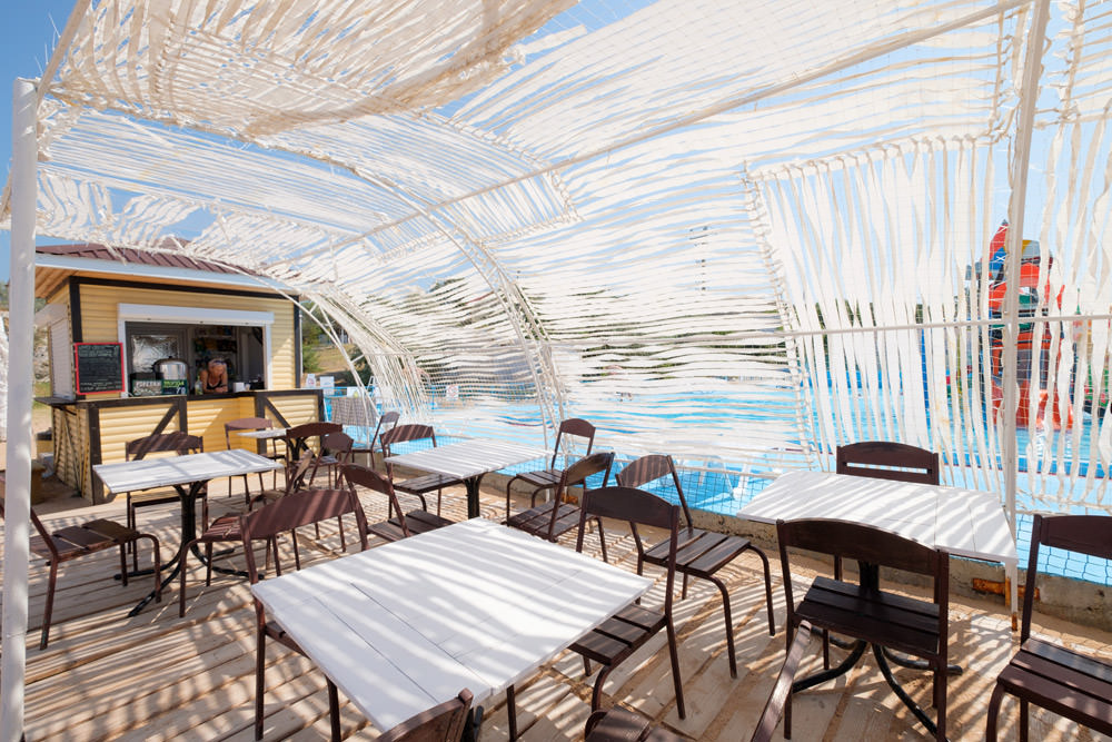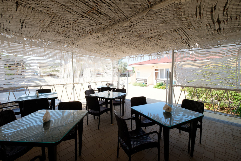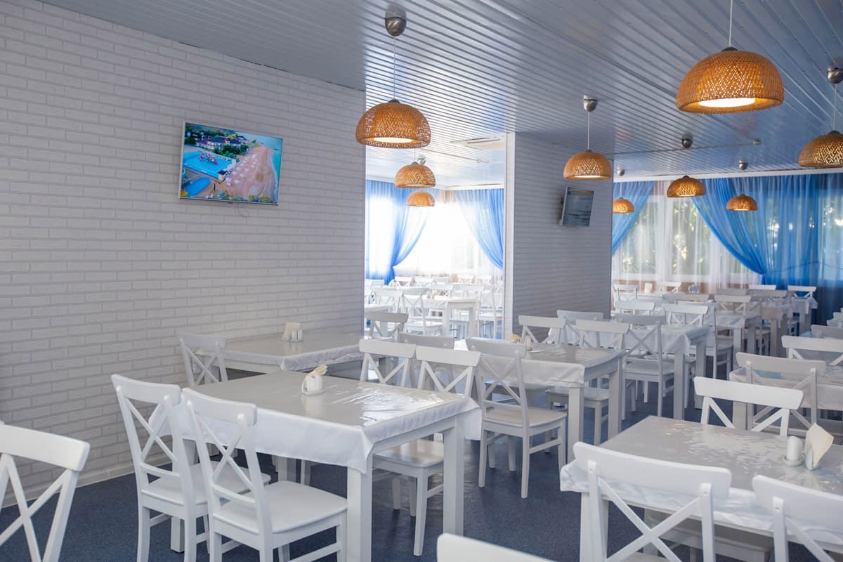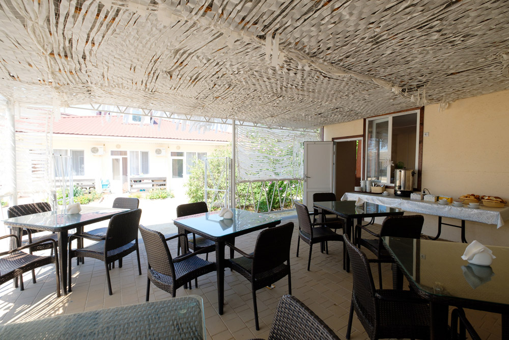 Помимо столовой на территории комплекса для гостей работает летнее кафе, отдыхающие могут заказать там сытные завтраки, вкусные обеды и ужины.